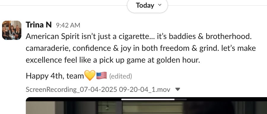 this is what American Spirit looks like when it skips therapy, lights a cigarette & skips straight to the golden hour delusions of brotherhood, baddies & bravado that still hits every time. *American Flag emoji*