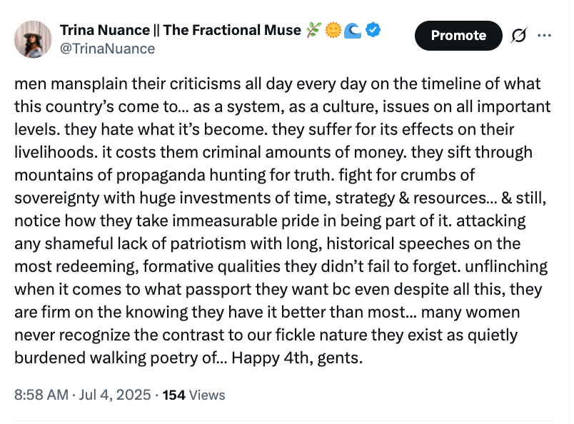 … when i reach the end of the sentence, i realize what day it is… i think of how romantic this idea is to land on today… America’s birthday. i start thinking about the concept of the American man & braindump this poetic musing next: