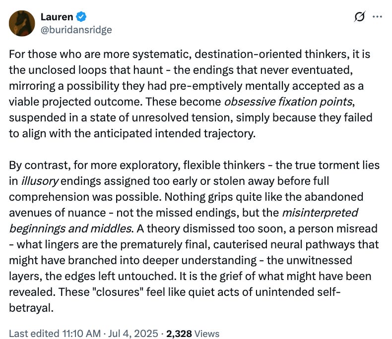 i reflect on advice i took about my personal life earlier this year. advice that didn’t sit right, but i trusted it anyway… this friend is way more the destination-oriented thinker in the tweet. & even if this is your first time reading me, you can probably tell i’m way more the exploratory, flexible archetype.