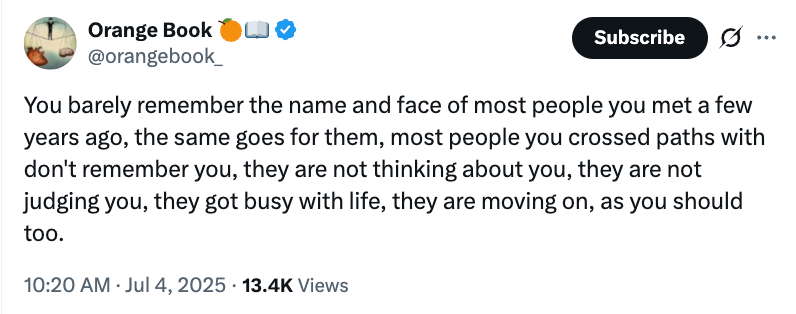 i don’t really know what the tweet’s point is. maybe it’s meant to nurture someone who fears the past watching them... not being fully present in the now they’re writing. either way, it wouldn’t usually stop me. i scroll past ideas i don’t resonate with all the time.